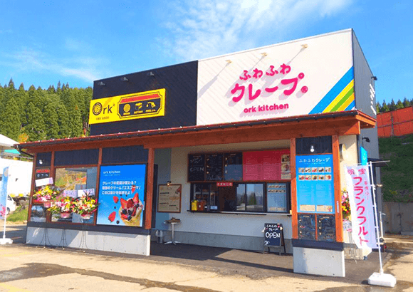 エスプーマホイップにOrkオリジナル生地を合わせ、厳選した素材をバランスよく加えたのがOrkのふわふわクレープです。ほかにもこだわりエスプレッソをはじめとしたカフェメニューや夏は自家製ミニトマトかき氷、秋は紅芋クレープなど季節限定メニューもご用意しております。春から秋にかけてはひるがのサービスエリア下線、冬季は高鷲エリアのスキー場でいつでもご賞味いただけます。